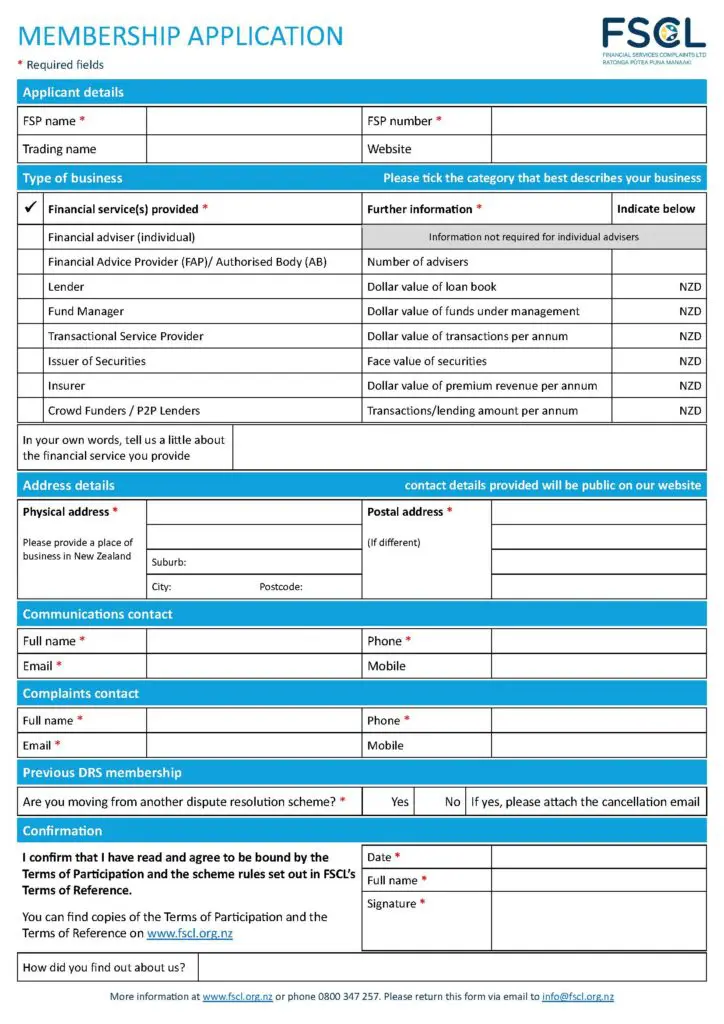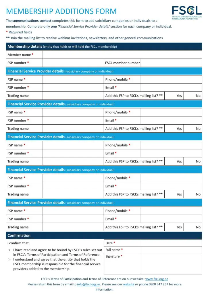 We require the information of all financial service providers (FSPs) that will list FSCL as their dispute resolution scheme. This means that any FSPs that will be covered under the membership (subsidiary companies, authorised bodies, advisers, or brokers) will also need to provide their information.